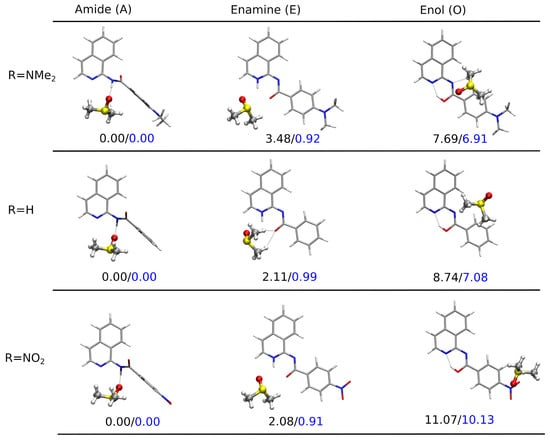 A similar scenario was observed in the hybrid implicit–explicit solvation model, and the corresponding optimized structures are presented in Figure 6. It can be easily observed that the position of the DMSO molecule was strongly dependent on the accessibility of the labile proton and significantly varied between the tautomers in this case as well. While for A and E, DMSO remained close to this proton and benefited from electrostatic interactions, in the case of O, the intramolecular hydrogen bond in the six-membered quasi-ring reduced the availability of the H13 proton for explicit solvent binding. Therefore, the relative energy of O grew to more than 6 kcal/mol, thus reducing its content in the mixture to traces only. The application of the hybrid implicit–explicit solvent model consistently indicated the best stability of the amide complex with DMSO in the case of all the substituents analyzed. However, the estimation of the mixture composition from the Boltzmann distribution provided a strong prevalence toward the amide tautomer (above 83% for all the substituents), while the experimental NMR considerations inverted the ratio from 3:1 in the case of the NMe derivative to 1:2 for the NO-substituted one. Thus, it is evident that both implicit and explicit models significantly contribute to the tautomeric equilibrium analysis, but their adequacy for a detailed study may strongly depend on the system under consideration and the setup of the whole simulation approach. Nevertheless, the explicit solvent seemed to be mandatory to reproduce the experimental findings in the analyzed equilibrium.