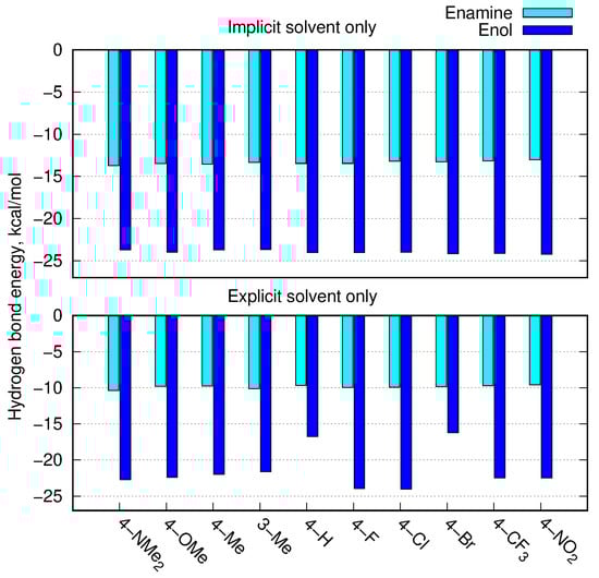 Estimation of intramolecular hydrogen bond energy (kcal/mol) in enamine and enol forms estimated according to Espinosa [28], for the B97X-D/def2-TZVP approach in the PCM solvent model (upper panel) and with the explicit solvent (lower panel).