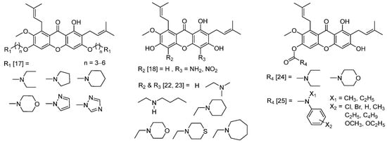 Synthetic N-containing α-mangostin analogs [17,18,22,23,24,25].