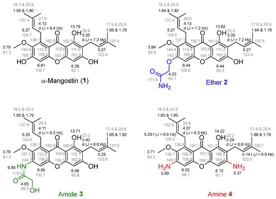 Compounds 2–4 were structurally characterized using spectroscopic techniques (Figure 2, and see Supplementary Materials for the NMR spectra). Besides the characteristic structures of xanthone 1, including a hydroxyl group at C–1, a prenyl group, an aromatic proton at C–4 and C–5, and a methoxy group at C–7, compounds 2–4 displayed 1H and 13C chemical shifts of additional motifs at C–3 and C–6. Compound 2, derived from the nucleophilic substitution step, showed the characteristic peaks of acetamide substituent from methylene proton (2′–CH2) as the singlet at 4.23 ppm for 1H and from primary amide carbonyl at 171.8 ppm and methylene carbon at 63.1 ppm for 13C chemical shifts. A significant upfield chemical shift of C–6 at 144.4 ppm was observed. Meanwhile, the characteristic proton chemical shifts of compound 3, a product of the rearrangement step, included the broad singlet of amide hydrogen (1′–NH) at 6.85 ppm (overlapped) and the singlet of methylene proton (3′–CH2) at 4.65 ppm. Regarding the 13C-NMR spectrum, amide 3 displayed secondary amide carbonyl at 170.0 ppm and methylene carbon at 68.3 ppm. An upfield chemical shift at an aromatic C–6 of amide 3 was observed. Compound 4, the final product of the Smiles rearrangement obtained from the hydrolysis step, showed the characteristics of proton chemical shifts of amine (NH2) at C–3 and C–6 at 5.37 and 5.69 ppm, respectively, along with chemical shifts of C–3 and C–6 aromatic carbons at 154.3 and 148.7 ppm, respectively. Upfield chemical shifts of aromatic carbon were clearly observed at C–2/C–3 and C–5/C–6.