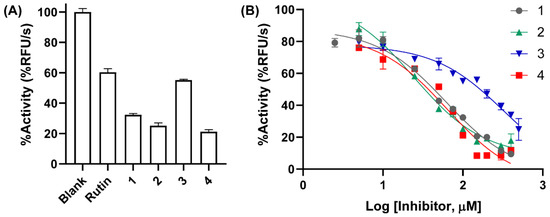 SARS-CoV-2 main protease (3CLpro) inhibition of α-mangostin (1) and N-containing α-mangostin analogs (2–4). (A) Relative protease activities treated with 100 μM of compounds 1–4 and rutin (positive control). (B) Activity of 3CLpro at various inhibitor concentrations.