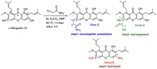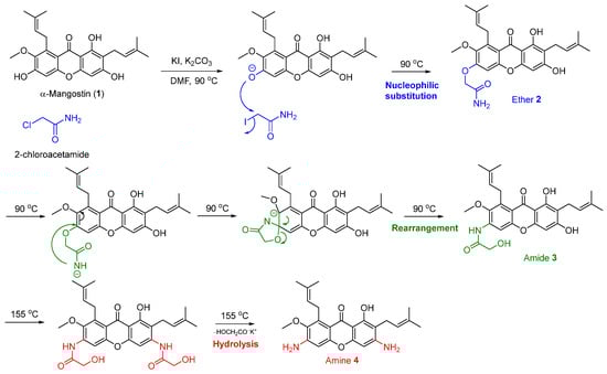α-Mangostin was isolated from dried mangosteen pericarp powder as the major natural xanthone. From the isolation and purification processes, 15.8 g of α-mangostin was obtained as a yellow powder, and the isolation yield was 3.2% based on the weight of the dried plant material. The structural identification of α-mangostin was confirmed using 1H and 13C nuclear magnetic resonance (NMR) spectroscopy [30,31]. The isolated α-mangostin was employed as the starting material for the investigation of the one-pot synthesis of N-containing α-mangostin analogs via Smiles rearrangement. The transformation of the hydroxyl groups of the phenol moiety of α-mangostin to primary amines via Smiles rearrangement requires the use of 2-chloroacetamide as an activating agent, potassium iodide (KI) as a catalyst, and N,N-dimethyl formamide (DMF) as a high boiling point solvent in the presence of a suitable alkaline base and heat to facilitate tandem nucleophilic substitution, rearrangement, and hydrolysis reaction (Scheme 1). The Smiles rearrangement of α-mangostin (1) commenced using 2.5 equivalent of potassium carbonate (K2CO3) as a base and 0.2 equivalent of KI as a catalyst to afford the series of N-containing α-mangostin analogs, including ether 2, amide 3, and amine 4, which were sequentially obtained through nucleophilic substitution, rearrangement, and hydrolysis, respectively. Interestingly, the regioselectivity of Smiles rearrangement at the hydroxyl group at the C–3 and C–6 positions was observed. The proposed mechanism for the Smiles rearrangement of α-mangostin (1) yielding the series of N-containing α-mangostin analogs 2−4 was illustrated in Scheme 2. The transformation of hydroxyl group at C–6 was observed as a major product at 90 °C. Both hydroxyl groups at C–3 and C–6 positions were modified at higher temperature (150 °C). However, the hydroxyl group at C–1 was intact because of the steric hindrance from an isoprene substituent at the C–2 and C–8 positions and stabilization via hydrogen bonding between a hydroxyl group at C–1 and ketone at C–9.