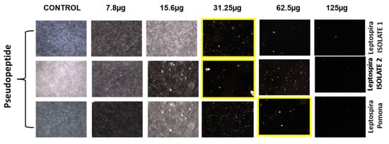 The pseudopeptide was evaluated for its anti-leptospiral activity using microdilution and the dark field microscopic technique against two isolated and one standard strain, L. pamona (Figure 2). It was observed that during the microdilution test, the pseudopeptide showed good inhibitory activity for both the isolates and also at concentrations of 31.25 μg, and L. pamona showed inhibition at a concentration of 62.5 μg upon treatment using the pseudopeptide.
