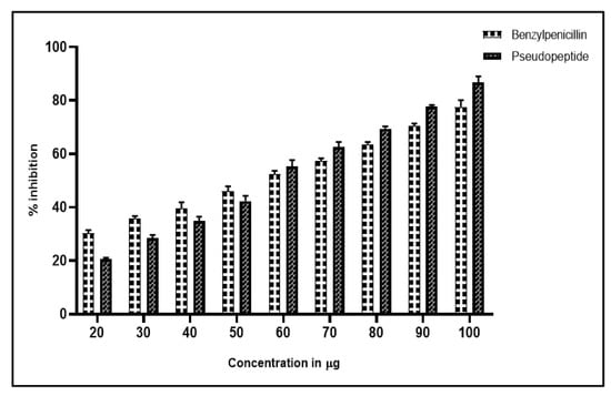 Antihemolytic profile of pseudopeptide exhibiting 30% inhibition of hemolysis at 25 µg per 100 µL concentration, with the highest inhibition of hemolysis of 85% at 100 µg per 100 µL concentration; whereas benzylpenicillin exhibits 20% inhibition of hemolysis at 25 µg per 100 µL concentration, with the highest inhibition of hemolysis of 75% at 100 µg per 100 µL concentration.
