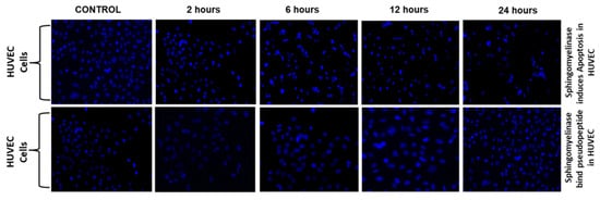 An increase of ROS and decrease of the mitochondrial membrane led to cell apoptosis. Hence, in the present study, we evaluated the mechanism of Sph2 that causes cell apoptosis in HUVEC cells. Flow cytometry was used to investigate the apoptosis levels in HUVEC cells with a combination of FITC-conjugated annexin V, pseudopeptide, and propidium iodide (PI) stain in a time-dependent manner, which shown in Figure 4. The addition of pseudopeptide resulted in a significant reduction of apoptosis in HUVEC cells from 48% to 18%. Further, Hoechst 33,342 staining was used to examine the morphological changes of cellular nuclei and cell apoptosis.
