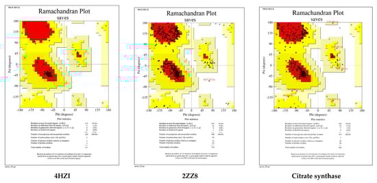 For the in silico study, three Leptospiral metabolic proteins were chosen. The structure of citrate synthase was modeled using homology modelling by the SWISS-MODEL server [], which is accessible via the Expasy web server and relies on the target and template proteins’ evolutionary relationship. The sequence for modelling this protein was obtained from NCBI under the accession number, WP_061270692. A search for homologous proteins in a library of experimentally known protein structures was used to identify potential structural templates. The structures of the other two Leptospiral proteins, the ATPase subunit of an orphan ABC transporter and LipL32 and the most abundant surface proteins of pathogenic Leptospira spp., were taken from the RCSB Protein Data Bank [] with the PDB ID 4HZI [] and 2ZZ8, each possessing a structure resolution of 1.85 Å and 2.01 Å, respectively (Figure 13).