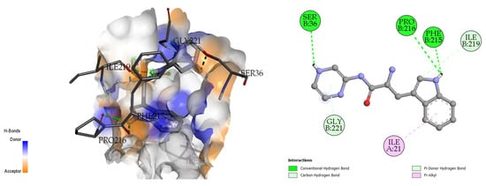 The docking analysis and visualization of the 2ZZ8 protein with pseudopeptide are shown in Figure 8. The pseudopeptide showed a comparatively greater binding affinity of −6.9 Kcal/mol. The amino acids that were involved in the docking interaction at the binding pocket of the 2ZZ8 protein include SER-36, PRO-216, and PHE-215.