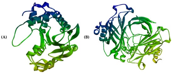 The selected protein structures were refined using the ModRefiner tool, which is accessible via the Zhang Lab web server. Using the PROCEHCK program from the online server, UCLA-DOE LAB—SAVES v6.0, the abovementioned protein structures were confirmed and evaluated for precision based on the Ramachandran plot. The proteins’ binding sites were identified using the CASTp (Computed Atlas of Surface Topography of Proteins 3.0) tool []. In a protein structure, it provides all inner cavities and surface pockets (Figure 14).