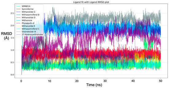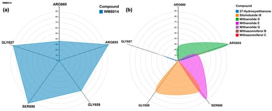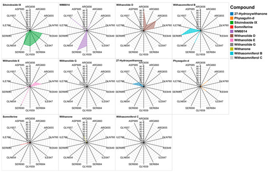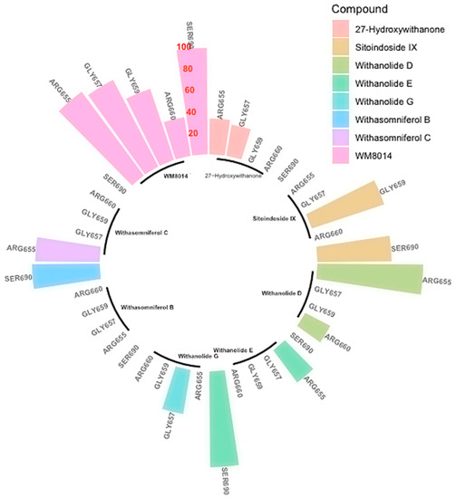 | 27-Hydroxywithanone | −8.5 | ARG660, LEU689, ARG692, TRP697, GLN760, LYS763 | ARG655, GLY657, GLN760 | |
