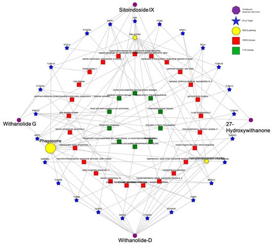 - Shannon, P.; Markiel, A.; Ozier, O.; Baliga, N.S.; Wang, J.T.; Ramage, D.; Amin, N.; Schwikowski, B.; Ideker, T. Cytoscape: A Software Environment for Integrated Models of Biomolecular Interaction Networks. Genome Res. 2003, 13, 2498–2504. [Google Scholar] [CrossRef]