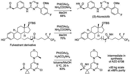 Since the discovery of this NH transfer reaction, it has been well-used in the synthesis of sulfoximines, and particularly in the preparation of drug analogues (for example, see Scheme 3). Reboul demonstrated the enantioselective synthesis of (S)-atuveciclib [74], and Lücking the preparation of a sulfoximine derivative of fulvestrant [75]. Most notable is the application from AstraZeneca in the preparation of an intermediate for AZD6738 [76]. The sulfoximine-containing intermediate was isolated as the HCl salt on a 30 kg scale in >99% purity and 83% yield. On this large scale, the reaction was performed in a mixture of toluene and methanol to facilitate an aqueous extractive work-up.