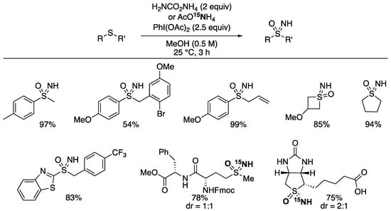 Ammonium carbamate could be readily replaced with ammonium acetate. This allowed for the use of the 15N labelled ammonium salt and hence the preparation of 15N-labelled sulfoximines [77]. This was applied to protected methionine amides and biotin, which further demonstrated the compatibility of the reaction with polar functional groups.