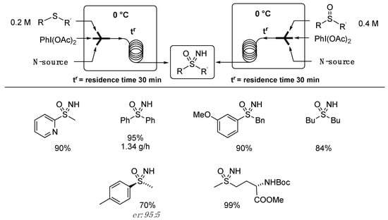 - Gutmann, B.; Elsner, P.; O’Kearney-McMullan, A.; Goundry, W.R.F.; Roberge, D.M.; Kappe, C.O. Development of a Continuous Flow Sulfoxide Imidation Protocol Using Azide Sources under Superacidic Conditions. Org. Process Res. Dev. 2015, 19, 1062–1067. [Google Scholar] [CrossRef]