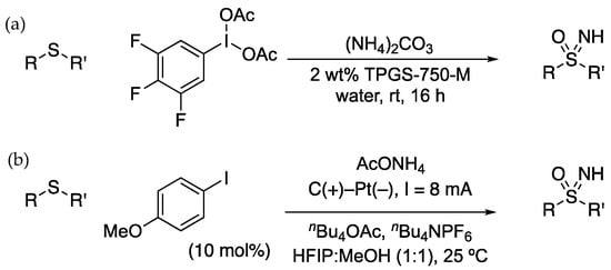 Zheng and Xu reported the NH/O transfer reaction in water using a recyclable iodine (III) reagent (Scheme 8a) [84]. Several arenes were examined on the aryl-I(III) reagents, and the 3,4,5-trifluorophenyl derivative gave the best outcome in both yield and recoverability. Reactions were run under micellar conditions to improve the solubility of the oxidant in water by the addition of a surfactant (TPGS-750-M). The iodide was then recovered after the reaction by extraction into heptane in an aqueous workup. An aryl iodide has also been used catalytically, along with an electrochemical oxidation to convert sulfides to sulfoximines (Scheme 8b). Kong, Wang, and Xu developed the anodic oxidation of trimethoxyiodobenzene to the corresponding I(III) reagent, which promoted the overall conversion of sulfides into sulfoximines [85].
