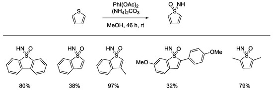 Bolm reported the preparation of thiophene sulfoximines as analogues of thiophene sulfones that are used in thiophene-based materials. Using NH/O transfer on this different substrate class of thiophene derivatives used 5 equivalents of PhI(Oac)2 and 3 equiv of ammonium carbonate as the ammonia source. Benzothiphenes were successful in this reaction, as was 2,5-dimethylthiophenes, and the substituents affected reaction yield (Scheme 10).