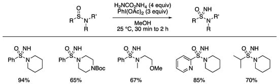 Using primary sulfinamides gave the corresponding sulfonimidate. By comparison, primary sulfinamides in the presence of hypervalent iodine reagents were reported by Malacria to form sulfonimidates in the presence of alcohols [98], as do secondary N-arylsulfinamides [99,100]. A mixture of side products was obtained with secondary sulfinamides, including the sulfonamide and sulfonimidate. Lücking and Stockman also developed a broad range of reactions for the N-functionalisation of the NH sulfonimidamides [101].