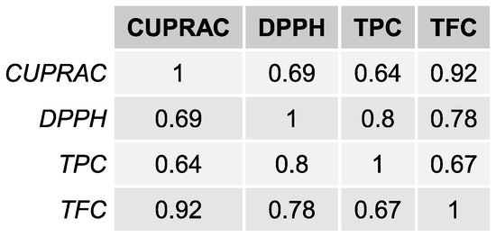 The correlation between the method results, DPPH, CUPRAC, TPC, and TFC are shown in Figure 1. A positive, strong correlation is observed between the CUPRAC and TFC (0.92) and between DPPH and TPC (0.80). The lowest correlation was found between the CUPRAC and TPC (0.64).