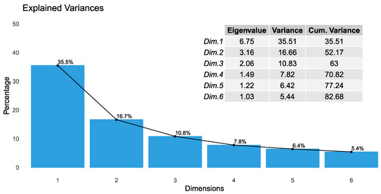 Principal components (PCs) were determined from the eigenvalues of the correlation matrix of observations. The eigenvalues were found to be 6.75, 3.16, 2.06, 1.49, 1.22, and 1.03 for PC1 to PC6, respectively. As can be seen in Figure 2, the first six PCs explain 82.68% of the total variance. The first two PCs account for 35.51% and 16.66% of the total variance, respectively. Thus, the first two PCs explain the origin of the score plot with a very tight confidence ellipse.