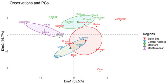 Recent studies have revealed that variables such as antioxidants and antimicrobial activities, individual phenolic and flavonoid substances of bee products are significant, with the greatest discriminatory power in a PCA [4,57,58]. Therefore, these variables were selected to accurately group the Anatolian propolis samples according to their geographical origin.