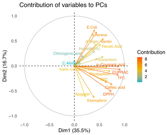 Contribution of variables (TFC, p-coumaric acid, DPPH, caffeic acid, etc.) to PCs.