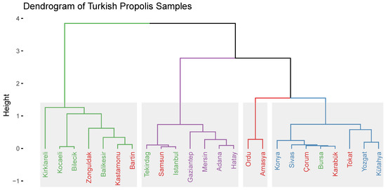 A dendrogram of the Turkish propolis samples was generated using a hierarchical clustering algorithm (HCA) with the Ward method using the packages FactoMineR and factoextra in R 4.0.4. This algorithm was applied to the first six PCs since they have eigenvalues greater than 1.0. Figure 5 shows the dendrogram and hierarchical clustering results of the Turkish propolis samples. As can be seen in Figure 5, the propolis samples are divided into four clusters. The Ordu and Amasya samples have a strong relationship with each other and are separated from all the other clusters. Although the Samsun sample belongs to the Black Sea region, it shows a greater similarity with the samples from the Marmara region group. In addition, the samples from the Mediterranean region and two of the samples from the Marmara region (İstanbul and Tekirdağ) are in the same cluster, as shown in Figure 5.