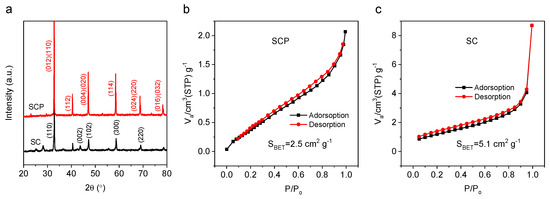 XRD (a) and nitrogen adsorption–desorption isotherms of SCP (b) and SC (c).