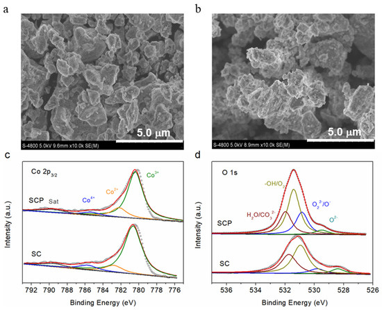 SEM images of SC (a) and SCP (b) materials. High-resolution Co 2p (c) and O 1s (d) X-ray photoelectron spectra of SC and SCP materials.