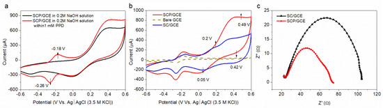 CV profiles for the SCP/GCE sensor tested at a 50 mV s−1 scan rate in an Ar-saturated 0.2 M NaOH solution with the presence and/or absence of 1 mM PPD (a); CV profiles for SPCE/GCE, SC/GCE and bare GCE sensors in the presence of 1 mM PPD (b); EIS for SPCE/GCE and SC/GCE sensors tested in 0.2 M NaOH solution at a frequency of 0.1 Hz to 1 MHz (c).