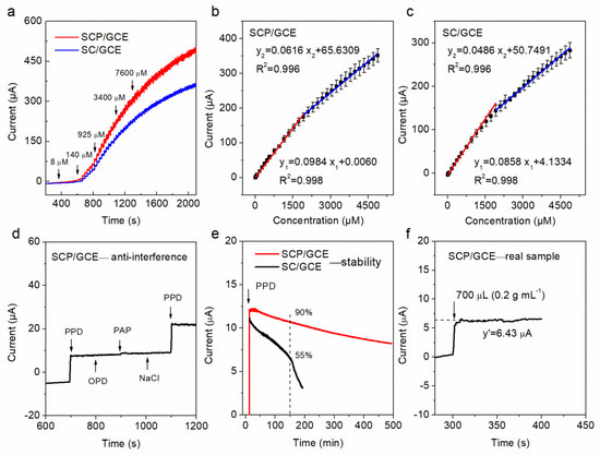 Chronoamperometric responses (I–t) for SC/GCE and SCP/GCE obtained in an Ar-saturated 0.2 M NaOH solution with a continuous injection of PPD (a); corresponding current–concentration (I–C) linear fitting results for (b) SCP/GCE and (c) SC/GCE; anti-interference (d), stability (e), and real sample tests (f) of the SCP/GCE electrode.