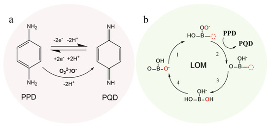 Oxidation effect of O22−/O− for PPD to PQD and the reversible electro-redox reaction mechanism between PPD and PQD (a); oxidation activity for PPD by the LOM (lattice oxygen mechanism with high active species of lattice O vacancies and adsorbed –OO) theory (b).