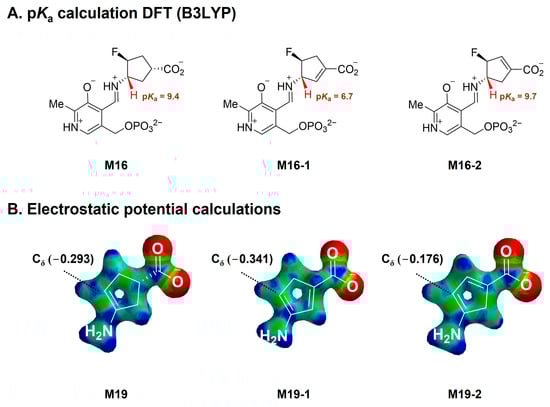 The deprotonation step (e.g., M16 to M17 in Scheme 3) is considered to be the rate-limiting step for enamine mechanism-based GABA-AT inactivators [3]. Previously, we used quantum mechanical cluster calculations on the deprotonation step, catalyzed by Lys329 in GABA-AT, to demonstrate that the ligand-PLP Schiff base M16-1 (Figure 2A) [13], containing the added double bond, displays about 3 kcal/mol lower transition state (TS) energy compared with intermediate M16. In this work, we performed theoretical pKa calculations using the DFT/B3LYP level of theory that we previously published [14,25,26] at 298K to predict the acidity at the Cγ position of difluoro analogs 4–6 (Table 1). The results, shown in Figure 2A, suggest that the hydrogen (highlighted in red) of PLP-bound 5 (M16-1) with an α, β-unsaturated carboxylate system displays the lowest pKa value among the three analogs, while the pKa value of the corresponding proton in PLP-bound 6 (M16-2) is not noticeably affected by the introduction of the double bond at the Cα and Cε positions relative to parent cyclopentane 4 (M16). Electrostatic potential (ESP) calculations [14] (Figure 2B) indicate that the nucleophilicity of Cδ in the enamine intermediate of 5 (M19-1) is much higher than that in the corresponding enamines of 4 and 6 (M19 for 4 and M19-2 for 6), suggesting that the Cδ position of M19-1 is more reactive than that in the other two intermediates, leading to more efficient enamine addition. In contrast, the enamine intermediate of 6 (M19-2) exhibits the lowest nucleophilicity, which should retard the attack at the internal aldimine, resulting in the modest inhibition of 6 on hOAT.