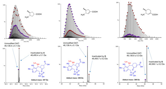 Three different enamine mechanism-based inactivators—4, 5, and 8—were used to fully inactivate hOAT, and these samples were utilized in denaturing the intact protein MS [14] to evaluate the covalent inactivation adducts formed for these three compounds. All the covalent mass shifts match the ketone adduct generated from the enamine addition pathway (Figure 3). Intriguingly, the major mass peaks are the modified peaks in the hOAT samples inactivated by 4 and 8 (Figure 3, left and right). In contrast, the apo-hOAT peak is the primary one in the sample treated with 5, while only a small portion of hOAT was covalently modified by 5 (Figure 3, middle). According to our prior experience [26], these differences indicate that, unlike 4 and 8, that noncovalent interaction is the predominant inactivation form in the case of 5.