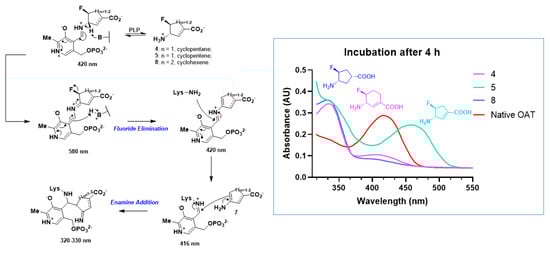 The subsequent wavelength absorbance measurement for 4, 5, and 8 after a 4 h incubation with hOAT (Figure 4, right) suggests that the final products of 4 and 8 exhibit maximal absorption at about 330 nm. This is consistent with the theoretical wavelengths (320–330 nm) for the final product generated from the enamine addition (Figure 4, left). In contrast, the final product of 5 displays a distinct maximal absorption at 460 nm.