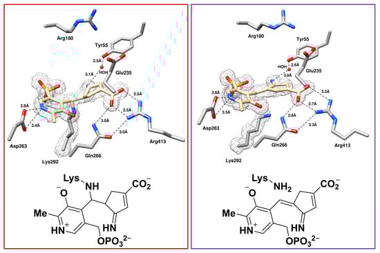 In the crystal structures of hOAT, inactivated by 4 (PDB code: 5VWO) and 8 (PDB code: 6V8D) [14,18], both compounds are covalently bonded to PLP, while their carboxylates interact with Tyr55 or Arg180. The structures of the hOAT-5 co-crystal (PDB code: 8EZ1), shown in Figure 5, suggest covalent modification of Lys292 by the ligand in one of the three protein copies as a minor form (Figure 5, left) and a noncovalent form of the ligand in the two other protein copies (Figure 5, right) as a major form. The conjugated structure of the noncovalent form explains the maximum absorbance at 460 nm. It should also be noted that the carboxylate group forms salt bridges with Arg413 and hydrogen bonds with Gln266 rather than interacting with Arg180 or Tyr55. Arg413 is known to form a salt bridge with Glu235 in the native enzyme [27], and this interaction was found to be preserved in most of the hOAT inactivators, such as the complexes with 4 and 8. In the case of noncovalent inhibition by 5, the ligand is located 2.8 Å away from Lys292, resulting in the additional translational freedom for the carboxylate group to anchor with Arg413. The unique binding orientation of 5 also led to a water-mediated hydrogen bond interaction between the imine group of the ligand and Tyr55 residue.