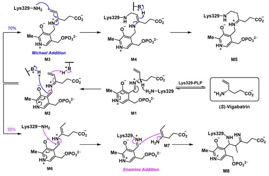 To date, vigabatrin (VGA, γ-vinyl-GABA, Scheme 1) is the only FDA-approved GABA-AT inhibitor for the treatment of infantile spasms that acts as a mechanism-based inactivator (MBI) [3,8]. MBIs initially react in a similar manner to substrates in the active site of the targeted enzymes and are converted into an activated species, which usually leads to inactivation either by covalent bond formation or tight-binding inhibition [9]. Mechanistic and crystallographic studies have demonstrated that 70% of vigabatrin inactivation of GABA-AT occurs through a Michael addition pathway: after deprotonation (M1 to M2) and tautomerization (M2 to M3) steps, electrophile M3 reacts with the catalytic Lys329 residue in GABA-AT to form a covalent bond (M4 and M5). Thirty percent of vigabatrin’s inactivation occurs via tautomerization of the vinyl group (M2 to M6); an attack by Lys329 generates enamine intermediate M7. This reacts with the internal PLP–Lys329 aldimine, leading to inactivated complex M8 (Scheme 1) [10].