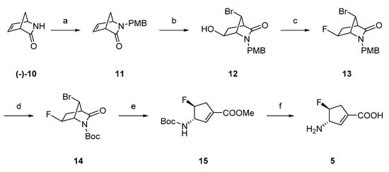 In the 10-step synthetic route that we previously reported for the preparation of 5 [13], an acid-assisted epoxide ring-opening reaction was utilized to form a bicyclic key intermediate containing a hydroxyl group on the bridgehead. The hydroxyl group was tosylated and employed as a leaving group to afford the desired cyclopentene ring through a one-pot lactam hydrolysis and β-elimination. To better support our mechanistic studies, in this work, we first optimized the preparation of 5 to a 6-step synthetic route (Scheme 4). Bicyclic lactam intermediate 12, bearing a bromo group on the bridgehead, was prepared from a chirally pure Vince lactam ((-)-10; (1R)-(−)-2-azabicyclo[2.2.1]hept-5-en-3-one; CAS#: 79200-56-9) following the procedure reported previously [22]. The hydroxyl-bearing carbon of 12 was fluorinated using DAST to generate 13 as a single diastereomer [13]. After switching the protecting group of the lactam from a PMB group to a Boc group (14), the lactam was hydrolyzed with K2CO3/MeOH. Simultaneously, the bromo group on the bridgehead of 14 was applied as a leaving group to induce β-elimination, forming the desired cyclopentene ring with the α,β-unsaturated carboxylate methyl ester (15). The Boc group and methyl ester of 15 were removed with HCl/AcOH to afford the final product (5) as an HCl salt.