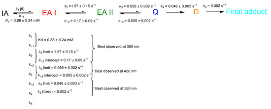The data extracted for 420 nm were fit by fixing the first phase to the kobs values determined for the first phase at 350 nm, where the first phase is well-delineated from the second. The second phase observed represents the decay of a second external aldimine-like species (see below) into a quinonoid with maximal absorption at 580 nm. The concentration dependence of the observed rate constant for the second phase gave a hyperbolic shape, indicating the reversibility of the prior step (k2 and k−2 in Scheme 6). These data also fit best to Equation (5), and the limit of this dependence revealed a limiting forward rate constant (k3) of 0.059 ± 0.002 s−1 for the formation of the quinonoid intermediate. For the reverse reaction (k−3), the rate constant was 0.005 ± 0.002 s−1, Figure 7B). The data extracted for 580 nm report the formation and decay of the quinonoid and the decay of the subsequent diamine-like species (Figure 7). These data were fit by fixing the rate constant value for the final phase that represents the apparently irreversible decay of the diamine-like species to 0.002 s−1 (k5). This was done in part because the endpoint of the final phase was not definitively captured at the limit of the data collection (1250 s), and so no measure of error was obtained for the rate constant of this step. The fit reveals that the dependence is again hyperbolic due to the reversibility of the preceding step (k3, k−3), that it has a net rate constant (k4) of 0.046 ± 0.003 s−1 with no evidence for reversibility and was fit to Equation (6). Scheme 6 depicts the summation of these observations.