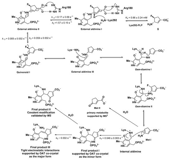 The incorporation of a double bond into a cyclopentane system has significantly improved the inactivation efficiency of our recent MBIs by enhancing the reactivity of the key Cγ hydrogen and providing conformational changes [26,43,44,45]. In this work, we carried out an integrated mechanistic study with hOAT and 5, demonstrating that the addition of a double bond also influences the inactivation mechanism pathways. Unlike the parent monofluorinated cyclopentane (4), showing a typical enamine addition mechanism, the α, β-unsaturated cyclopentene 5 mainly inactivates hOAT through noncovalent, tight-binding interactions. This has been fully characterized by intact protein MS, wavelength absorbance measurements of the final products, and co-crystallization. The co-crystal complex also reveals for the first time that, in both the minor covalent and major noncovalent forms, the carboxylate group of 5 establishes unusual salt bridges with Arg413 rather than salt bridges with Arg180/Tyr55, as was previously observed in all the co-crystals of hOAT with other MBIs [14,26,28,45]. The transition state kinetics further indicate that a secondary external aldimine is formed between the first external aldimine and the first quinonoid transitions. Supported by molecular docking and free energy calculations, we propose the potential existence of an enolate intermediate that might be converted from the carboxylate of 5 and participate in the inactivation cascade directly. Overall, compound 5 inactivates hOAT through a unique enamine addition mechanism. These results will aid in the future design of selective hOAT inactivators.