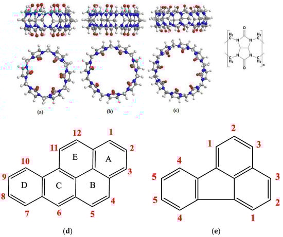 Top and side view of (a) CB[6], (b) CB[7], and (c) CB[8], general structure of CB[n] to the left. The structures of (d) Benzo(a) Pyrene and (e) Fluoranthene.