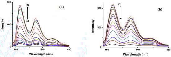 In aqueous media, FLT shows excitation maxima at a wavelength of 350 nm, and a structureless broad emission peak that extends from 400 to 500 nm, centered on 455 nm (Figure 4). Significant enhancement of this broad emission band can be observed upon incremental additions of CB[n] aqueous solutions to 1.0 × 10−6 M FLT solution, as shown in Figure 5. This denotes an increase in the rigidity of the guest and a decrease in the energy wasted by internal conversion and collision with the solvent due to complex formation [31]. The increase in intensity became almost constant with increasing CB[6] at concentrations higher than 3.5 × 10−4 M, indicating an equilibrium state (Figure 5a) [40]. The large size of FLT compared to the CB[6] cavity volume possibly gives rise to an external association complex. The behavior of the FLT-CB[7] and FLT-CB[8] complexes are fairly similar, with similar emission enhancement trends; Figure 5b,c.