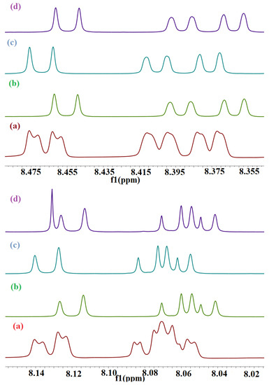 The nuclear magnetic resonance (NMR) spectroscopy experiments were carried out using a Bruker Avance Ⅲ HD 700 MHz spectrometer (Bruker, Karlsruhe, Germany) equipped with a 5 mm TCI H/C/N cryoprobe. The proton NMR experiment was run using the zg30 pulse program operating at 700.13 MHz. The acquisition parameters were as follows: 90° proton pulse width of 8.00 µs, relaxation delay of 1 s, and 128 scans. The spectrum was recorded at 298 K and processed using TOPSPIN 3.2 software (Bruker, Billerica, MA, USA). All host–guest complexes were prepared with DMSO-d6. All chemical shifts (expressed in ppm scale) are referenced to the solvent signal (DMSO-d6). 1H NMR data were processed with MestReNova v6.0.2-5475 software (Mestrelab Research S.L., Santiago de Compostela, Spain).