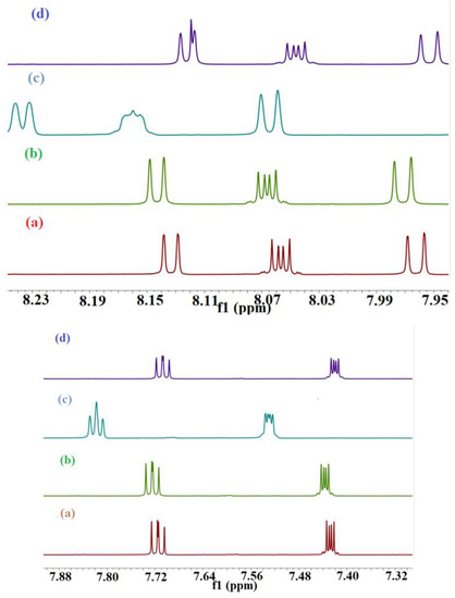 The 1H NMR of pure fluoranthene (FLT) exhibited five different aromatic peaks that were in good agreement with the documented values, ranging from 8.143 ppm to 7.438 ppm, which were shifted upon addition of the three hosts (Figure 7), giving evidence to support complexation [47]. It is worth mentioning here that FLT is a non-alternate aromatic hydrocarbon-containing angle strain that has different physicochemical behavior from an alternant one [48]. CB[8] is the only host that shifted the guest proton signal up-field, as shown in Figure 7d, hence the interior of the CB[8] cavity provides magnetic shielding to the protons of the included guest. The CB[8] cavity width is slightly too small to allow horizontal encapsulation of FLT, so it is diagonally located with respect to the axis of CB[8] [34]. Diederich et al. confirms that all protons in the direction perpendicular to the plane of the host are shifted up-field [49]. All FLT protons are shifted downfield after the addition of CB[6] and CB[7]; Figure 7b,c. This result is indicative of complex formation. The observed downfield shifts of the guest protons can be attributed to the anisotropic effect change in their surrounding environment [50]. After complexation, the radius of gyration of our guest is small which moves the guest protons more near the deshielding cone of the benzene ring and they will be affected by it more than the cavity hydrophobic shielding effect. The analysis of which specific guest protons are shifted up- or down-field provides important structural information about the nature and the specific mode of the inclusion. The question is: do parts or all the guests reside inside the cavity? And which side of the molecule is inserted into the cavity of the host? The value and sign of ∆δ are summarized in Table 4 and Table 5 could provide answers to these questions. All protons of the guest have been shifted with the same sign which is decided by the host used, for instance ∆δ is >0 for the FLT-CB[6]/CB[7] complexes and <0 for the FLT-CB[8] complex. This indicates that they are exposed to the same impact. As mentioned in the literature, the variations in hydrogen chemical shifts are mainly due to the difference in the C-C (π) and the C-C (σ) contributions [51].