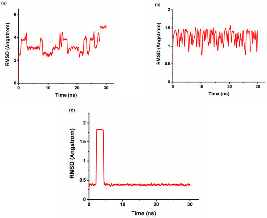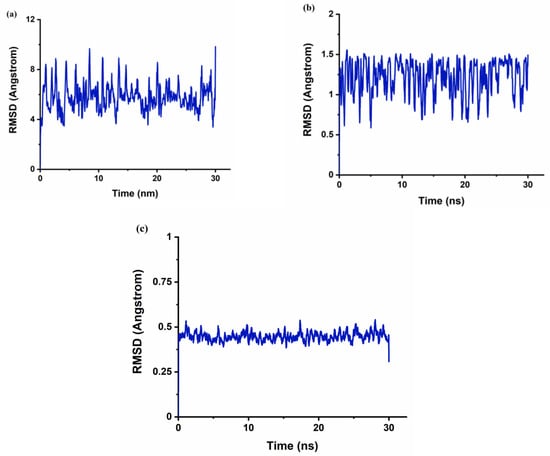 The time dependence of the root-mean-square deviations (RMSD) of atomic positions in the MD-simulated complexes of FLT with CB[n] from those in the corresponding energy minimized structure. (a) FLT-CB[6]; (b) FLT-CB[7]; (c) FLT-CB[8].