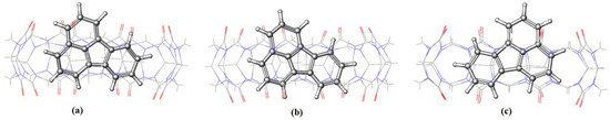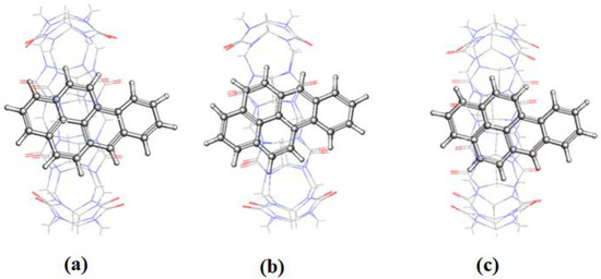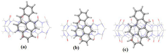 The initial structure of BaP and FLT were built using Chemdraw and their geometries optimized using the DFT-B3LYP method using a 6-31G* basis set [25]. On the other hand, the structures of the hosts were extracted from the crystallographic parameters provided by the Structural Data Base System of the Cambridge crystallographic data center and were optimized by minimizing their energy using the PM6 semi-empirical method using MOPAC 2012 [26,27].
