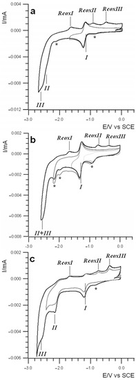 The first reduction was followed by a second voltammetric wave with a two-electron peak at about −2.3 V, which occurred just at the edge of the potential window allowed by the solvent. This last voltammetric peak was completely irreversible, and only a careful inspection of the voltammetric features highlighted the presence of two subsequent overlapping processes with potentials very closely spaced (labeled as II and III in Figure 1a). Moreover, on the backward potential scan, three small reoxidation processes were spawned with peak potentials reported in Table 1, thus suggesting a reaction mechanism of the molecule, following up the second reduction voltammetric peak (vide infra for a description of the mechanism). In the case of Mn-OMe, two other smaller reduction peaks were observed at −0.9 V and −2.2 V, respectively (indicated with asterisks in Figure 1b), that are related to the reduction of some decomposition products. In fact, although all the CV experiments were carefully carried out in dark conditions, the Mn-OMe derivative was highly photosensitive, even upon exposure to indirect sunlight, making the prevention of some partial decomposition impossible. The photostability of the complexes in different solvents has been investigated and fully reported elsewhere [28].