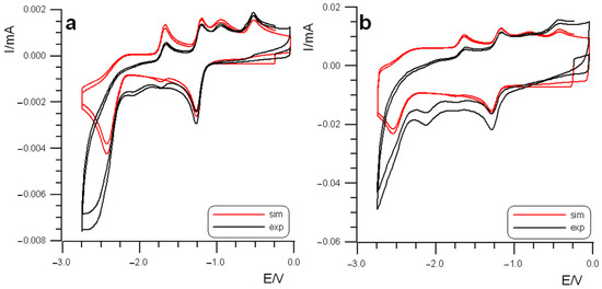 Simulated voltammetric curves (Antigona software version 1.0) juxtaposed on the original experimental data of Mn-SMe. Simulations parameters fitted using experimental CVs with scan rate 0.4 V/s (a) and 10.0 V/s (b). Ar atmosphere, TBAH/DMF electrolyte solution, working electrode: GC; reference electrode: SCE; T= 298 K.