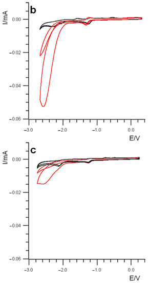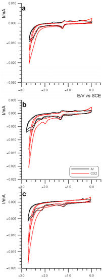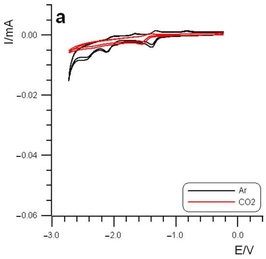 After the preliminary voltammetric investigation in an inert atmosphere, the solution was saturated with CO2. The presence of CO2 led to a remarkable change in the voltammetric pattern with an increase in the current of the two-electron peak occurring at a potential more negative than −2.0 V for all four systems, thus indicating that the highly reduced transient species, electrogenerated at those potentials, are affected in some way by the presence of carbon dioxide. Such an increase in the current wave overlapped with the two-electron peak (i.e., processes II + III) overwhelming it and revealing what looks like a solvent discharge, as shown in Figure 3 for all the Mn complexes. Moreover, it is worth noting the complete absence of the sequence of the three reoxidation processes on the reverse anodic scan, thus suggesting that the new process completely overturns the previously detected one in argon (Figure 3).