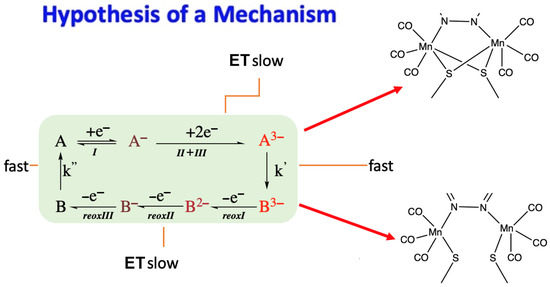 In this respect, some preliminary molecular orbital DFT calculations on the Mn-SMe species were carried out, confirming that the first reduction is mostly centered on the diazine bridging ligand, while the subsequent two electron injections are mainly metal-centered. Moreover, while the molecular structure optimization at the M06/3-21G* level of the theory for the first reduced species Mn-SMe did not show any significant Mn-S bond elongation (only 0.02 Å), when the second electron was added, the optimization of the two-electron reduced the molecular structure, evidencing a rather large increase (0.22 Å) in one of the two Mn-SR bridging bonds for both the ancillary ligands. Such a 0.22 Å value is an undoubtedly a clear indication and theoretically supports the “opening” of the ancillary bridges (see Figure S1 in the Supplementary Materials).