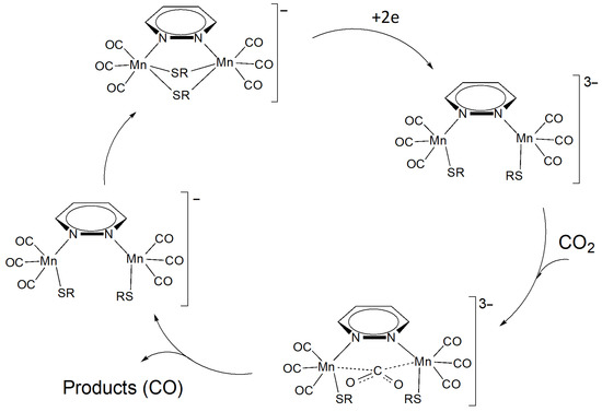 The notable large difference of activity between the O-based and S-based bridging moieties for the two systems Mn-OMe and Mn-SMe, respectively, is proof of the influence of the ancillary ligand on the catalytic performances, as reported for the analogous rhenium complexes [22]. In Mn-SMe, both Mn-S bond cleavages take place almost simultaneously, without the decomposition of the complex and/or the formation of an Mn-Mn direct bond, allowing both the metal centers to interact with CO2, as shown in Scheme 3. It is unlikely that two CO2 molecules have enough room to interact independently with both nuclei, but, as previously reported in the literature, a dinuclear reaction site can outperform two independent mononuclear ones, as demonstrated in Re-based systems [19].