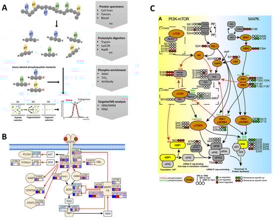 (A) Standard workflow for targeted analysis of protein phosphorylation. Selected studies have demonstrated the use of SRM to measure phosphorylation dynamics of signaling molecules complexes such as the (B) EGFR-MAPK pathway [53] and (C) PI3K-mTOR and MAPK pathway [54].